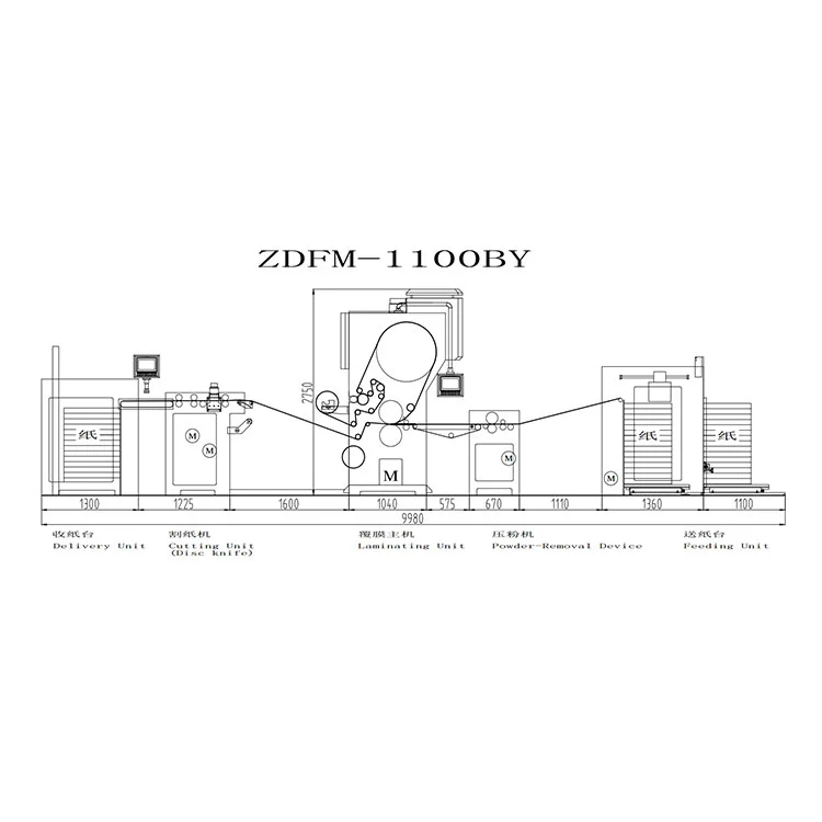 Painomateriaali kuljetetaan paperikuljettimella määrättyyn etuasentoon ja syötetään sitten sisään. Kalvo syötetään sisään syöttölaitteella, päällystetään liimalla ja kuivataan. Paperi ja kalvo paineistetaan sähkömagneettisella kuumennustelalla ja kumisella puristustelalla, minkä jälkeen ne laminoidaan. Leikkaa paperin päällekkäinen osa veitsilaikalla tai hiomapaperipyörällä ja irrota paperi paperinvetotelalla. Ja sitten erotetut valmiit tuotteet lähetetään automaattiseen paperin vastaanotto- ja pinoamisjärjestelmään kuljetinhihnalla yksittäisten valmiiden tuotteiden keräämiseksi.